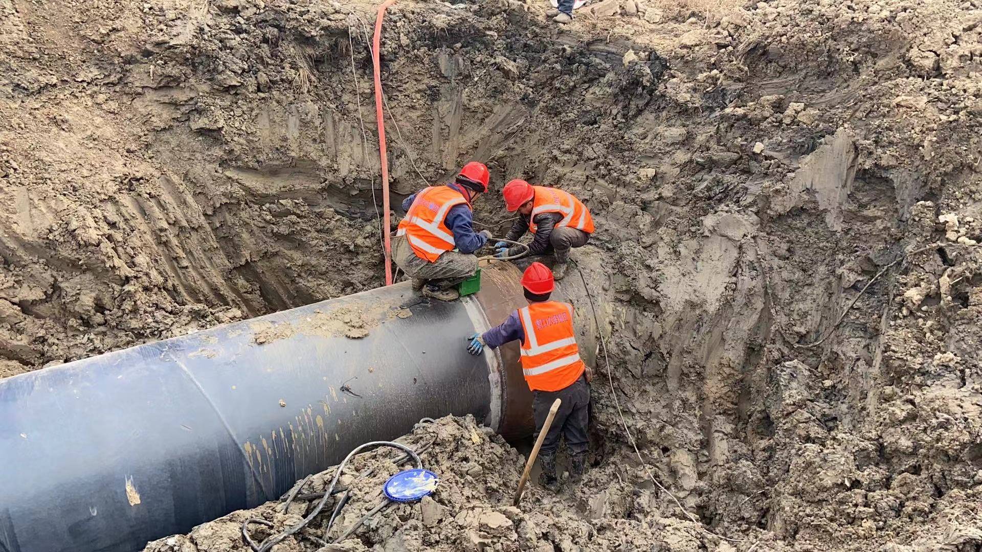 3月26日清晨6點,維修作業(yè)準時拉開帷幕。此次作業(yè)面臨著不小的挑戰(zhàn),待遷移的DN1400管線口徑大,且由玻璃鋼管與螺紋鋼管兩種不同材質(zhì)管材連接而成,這無疑增加了施工難度。尤其是在轉(zhuǎn)換件連接環(huán)節(jié),對口精確度的要求近乎苛刻,稍有偏差就可能導(dǎo)致膠圈翻折,影響供水安全。面對這一難題,經(jīng)驗豐富的作業(yè)人員憑借精湛的技藝和高度的專注,嚴格把控每一個施工細節(jié)。